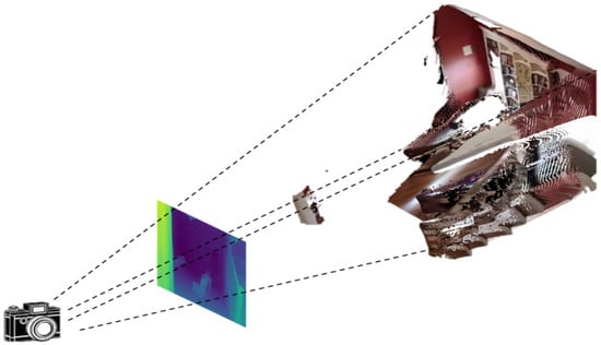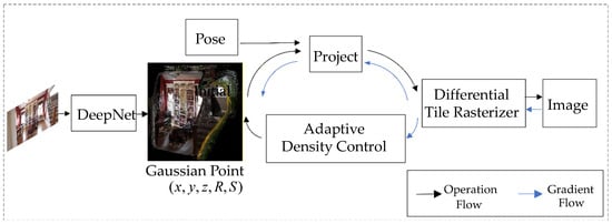 The depth map resampling and Gaussian point projection strategy are adopted to further improve the quality and distribution density of the initial point cloud. Specifically, through the resampling of confidence, the low-confidence regions are filtered, and the high-confidence regions are resampled based on probability density, which effectively avoids the interference of unreliable depth predictions on Gaussian initialization and ensures that the key geometric regions have sufficient point density support. This strategy provides a stable basis for the accurate allocation of subsequent Gaussian attributes (color, opacity, position, shape, etc.) and improves both the stability of the overall rendering process and the ability to restore details. Finally, the process generates the dual-mode input information of the fusion image and point cloud. The image provides appearance information such as texture and color, while the deep back-projection point cloud provides the geometric structure prior. This fusion of cross-modal information has laid a solid foundation for attribute modeling and rendering optimization of the subsequent 3DGS network. The depth of a prior-driven back-projection process is shown in Figure 6.