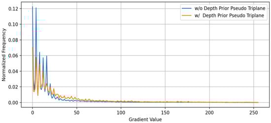 At the same time, starting from the basic principle of pixel value perception geometry, this paper explains the ability of geometry perception. The basic principle of pixel value perception geometry is that the brightness, color, texture, edge, and other information of the image reflect the projection expression of 3D geometry in 2D space. By analyzing the statistical laws, change patterns, and spatial distribution of these pixel features, the potential geometric perception ability can be indirectly inferred. To demonstrate this, we present an analysis of the geometric perception ability on Scene1 from Figure 9. First, we analyze the depth histogram shown in Figure 11. When the depth prior and pseudo-triplane are not used, the distribution is relatively concentrated, the depth width range is small, and the geometric depth perception is fuzzy in the range of 40–60 pixels. When using depth prior and pseudo-triplane, there is a clear dominant depth range, and there is a clear scene depth range in general. The perception is clear at 40–60 pixels, but poor at 175–200 pixels. Second, we analyze the depth gradient histogram shown in Figure 12. When the depth prior and pseudo-triplane are not used, the gradient histogram changes violently, the image depth is discontinuous, and the perception is fuzzy. When using depth prior and pseudo-triplane, the gradient distribution is smoother, and the depth geometric edge continuity is better.