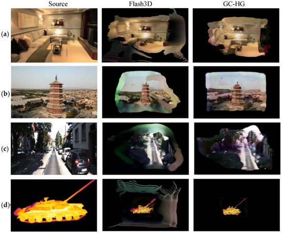 To demonstrate the scene reconstruction capability of our algorithm, Figure 15a–d visualize 3D models generated from both the RealEstate10K dataset and in-the-wild internet data. These visualizations highlight the reconstructed geometric structure of each scene. Compared to Flash3D, GC-HG has better reconstruction of the sofa in scene (a), maintaining higher fidelity in geometric details near the image edges. For the Yingxian Wooden Tower scene (b), our method preserves the consistency and integrity of floor edges, while Flash3D has point cloud fragmentation. The generated 3D models often need to be scaled and displayed according to the needs of different scenes or tasks, such as small-scale local detail analysis (1:1.2 scale in Figure 15a), large-scale urban modeling (1:2 scale in Figure 15b,c), and large military targets (1:3.3 scale in Figure 15d). These changes not only test whether the model can maintain global geometric stability but also test whether it can preserve the consistency of the edge and local details in the process of scaling. Results show that GC-HG preserves both the integrity of the overall scene structure and geometric consistency in fine-grained edge details.