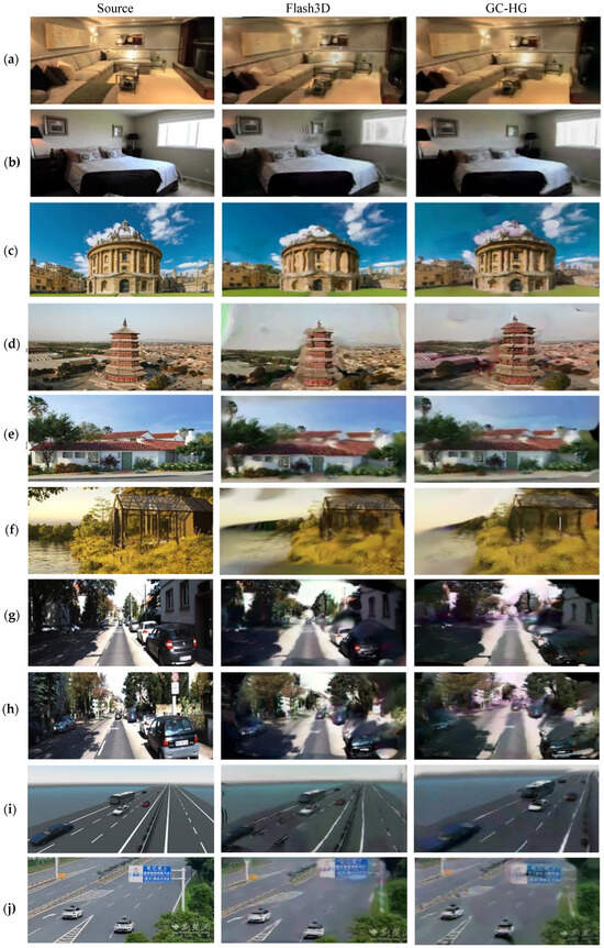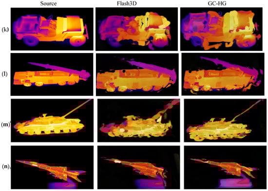 To evaluate the cross-scene generalization of GC-HG in complex real-world scenes, we extended our experiments to indoor, architectural, autonomous driving, and military infrared scenes. As shown in Figure 16a–j, distinct performance characteristics are observed. In indoor scenes a,b, the rendering quality of Flash3D is acceptable, but there are obvious ring artifacts and ripple distortions in flat, low-frequency areas (e.g., near the wall and bedside cabinet). Additionally, the brightness is too high, resulting in overexposure in certain areas. In contrast, while GC-HG retains some textural details, its clarity is reduced, exhibiting slight blurring and dark angle effects. In architectural scenes c–f, Flash3D has geometric deformations on architectural appearances (e.g., domes, wooden towers, and house roofs), with distorted edges. While GC-HG improves geometric preservation, it encounters color smearing and purple color shifts. In autonomous driving scenes g–j, neither performance is ideal. Flash3D partially preserves the shape of vehicle body, while GC-HG has color shifts. Additionally, as the model has not been trained on text within this specific scenario, the reconstructed Chinese characters may appear blurred. In infrared military target scenes k–n(we employed iron-red color mapping to convert the single-channel infrared greyscale image into a color image), Flash3D maintains the target shape, but structural disorder and fuzzy diffusion occur in local areas (e.g., the tank barrel). GC-HG is more compact with fewer artifacts yet presents a certain “atomization” phenomenon. To sum up, Flash3D is prone to artifacts in the sharpening process, while GC-HG can maintain the geometric structure, but there are color shifts in outdoor architectural scenes.
