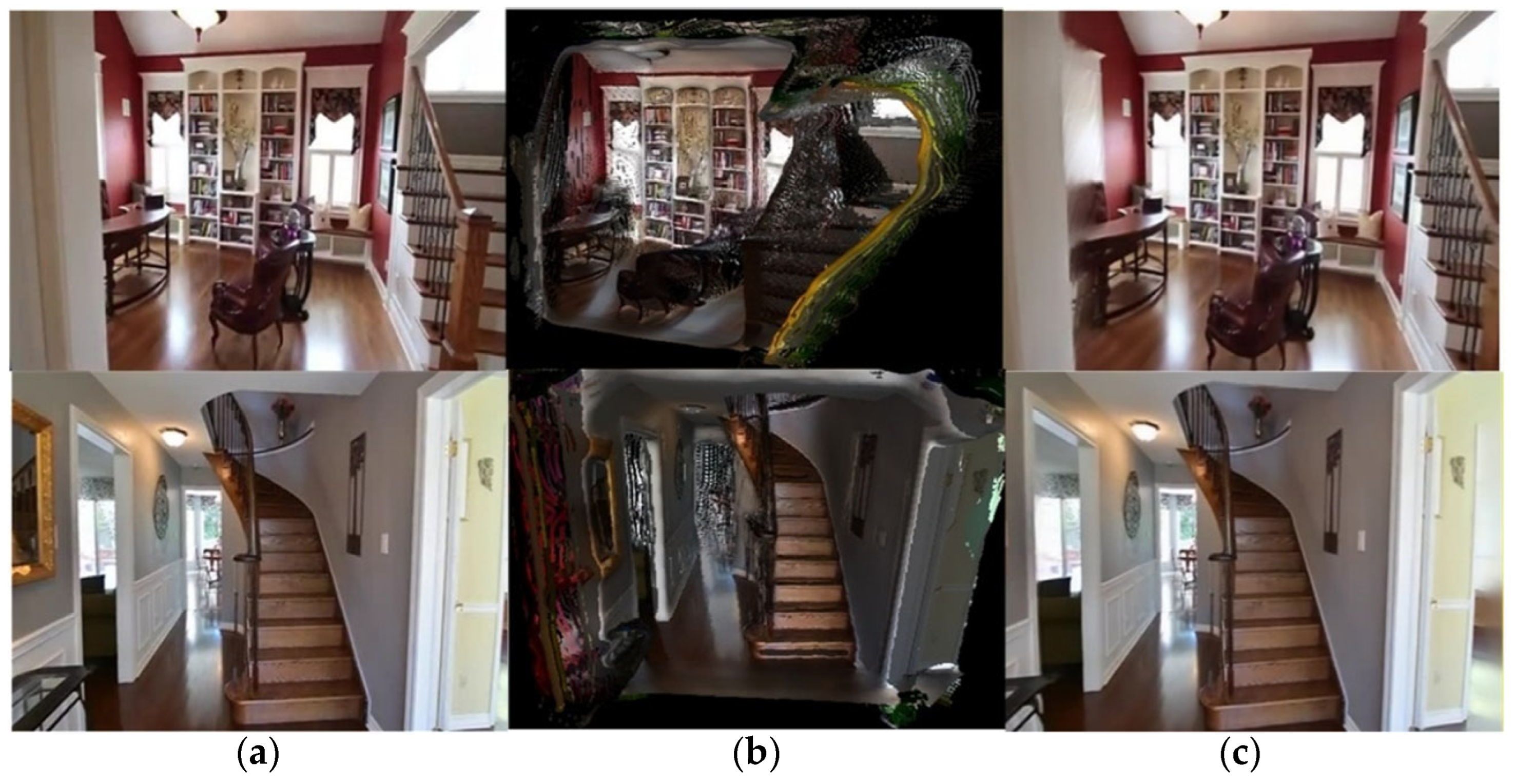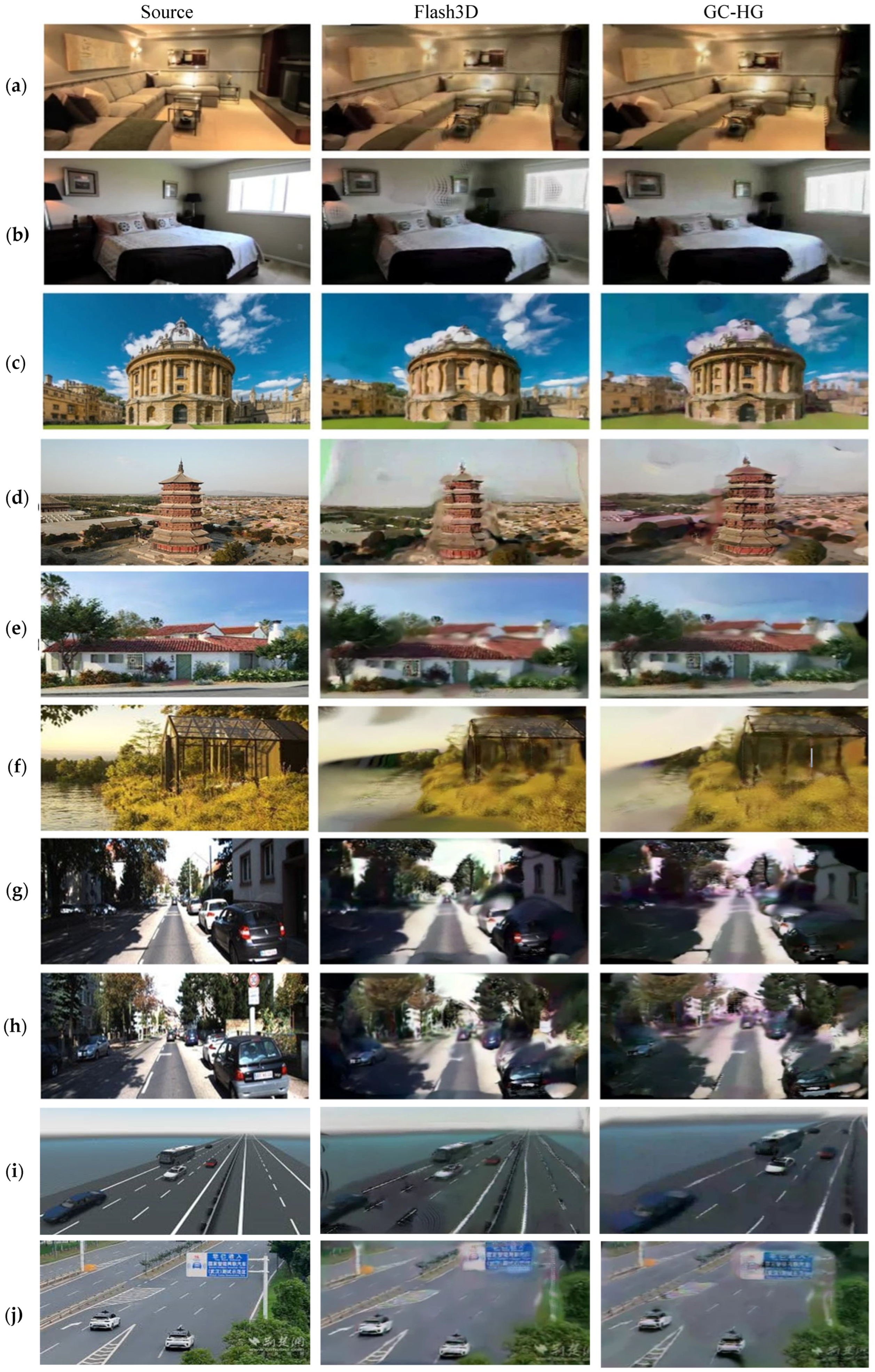 - Szymanowicz, S.; Insafutdinov, E.; Zheng, C.; Campbell, D.; Henriques, J.F.; Rupprecht, C.; Vedaldi, A. Flash3D: Feed-Forward Generalisable 3D Scene Reconstruction from a Single Image. arXiv 2024, arXiv:2406.04343. [Google Scholar]