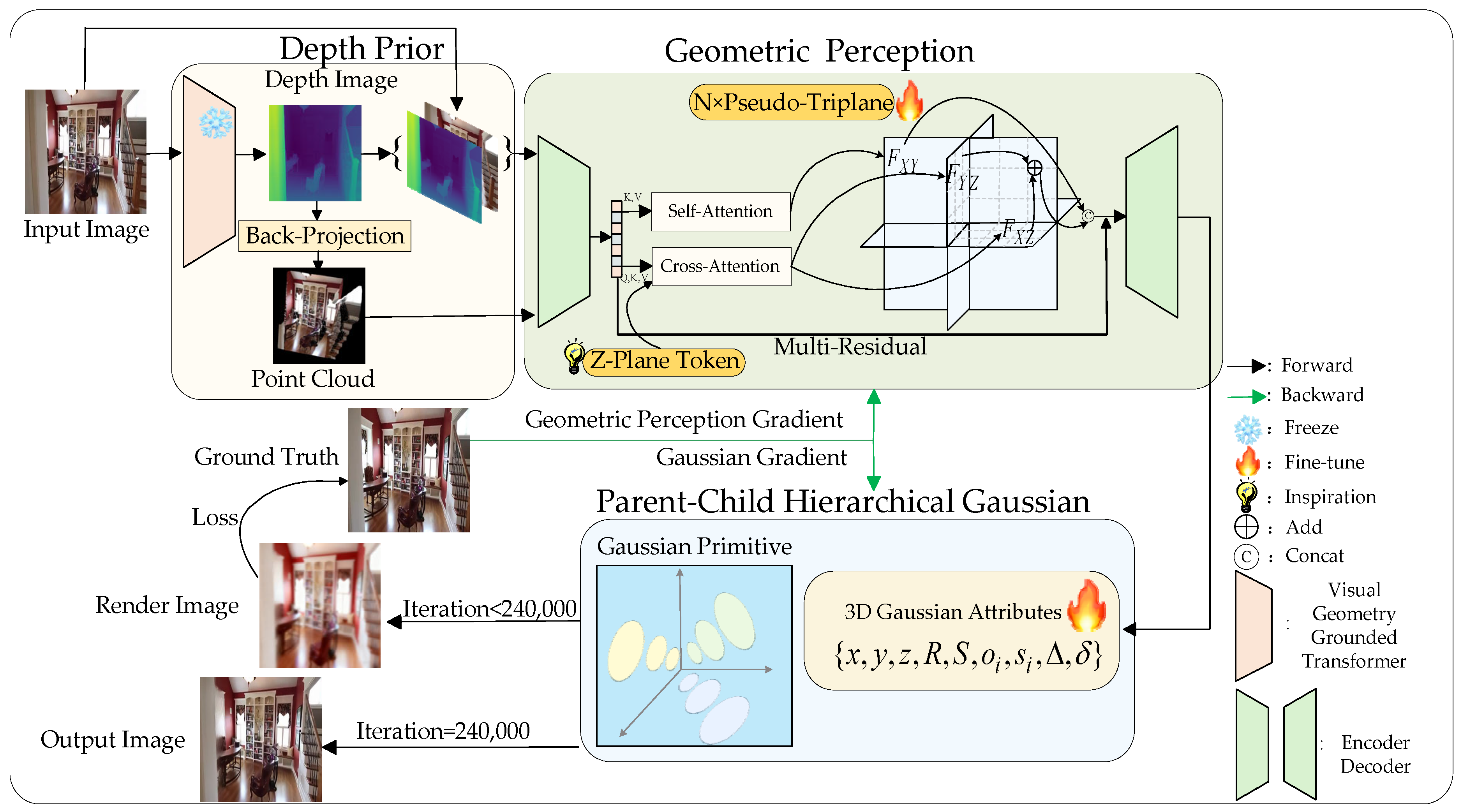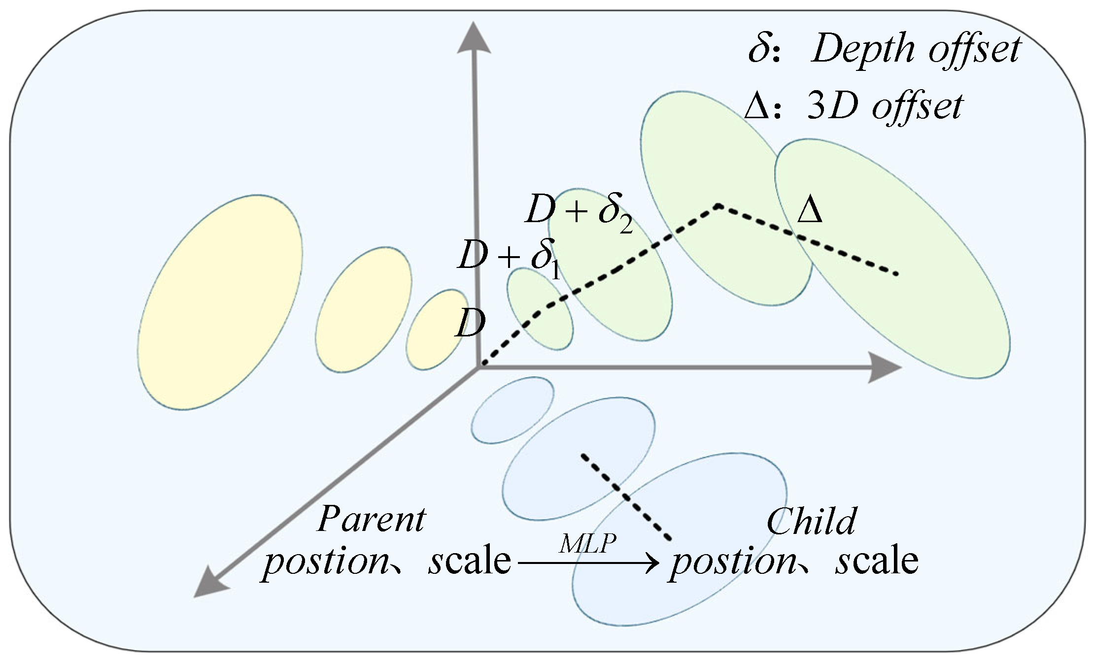 - Parent–child hierarchical Gaussian renderer modeling depth hierarchy: in the feed-forward 3DGS framework, we design a parent–child hierarchical Gaussian renderer to models multi-level spatial structure by combining depth and 3D offsets. A multi-layer perceptron (MLP) learns the linear mapping between parent and child Gaussians, enhancing the model’s ability to represent complex depth hierarchies.