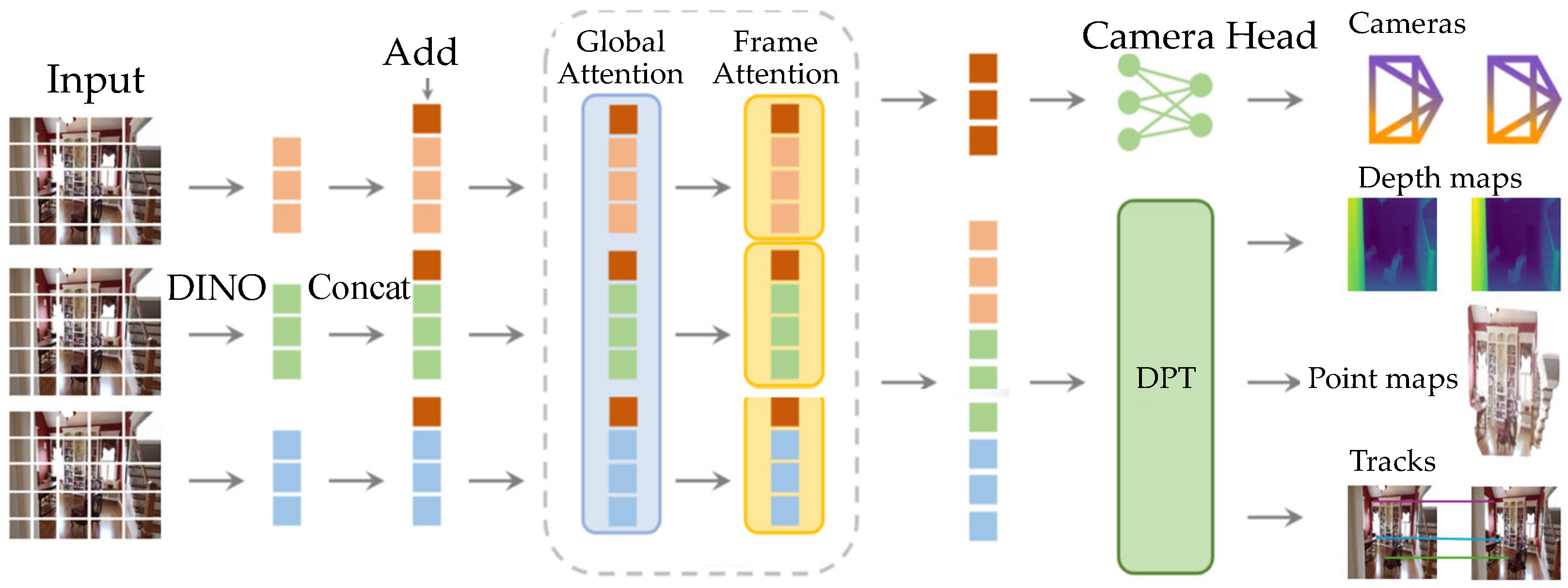 - Wang, J.; Chen, M.; Karaev, N.; Vedaldi, A.; Rupprecht, C.; Novotny, D. VGGT: Visual Geometry Grounded Transformer. In Proceedings of the IEEE/CVF Conference on Computer Vision and Pattern Recognition (CVPR), Nashville, TN, USA, 11–15 June 2025; pp. 5294–5306. [Google Scholar]