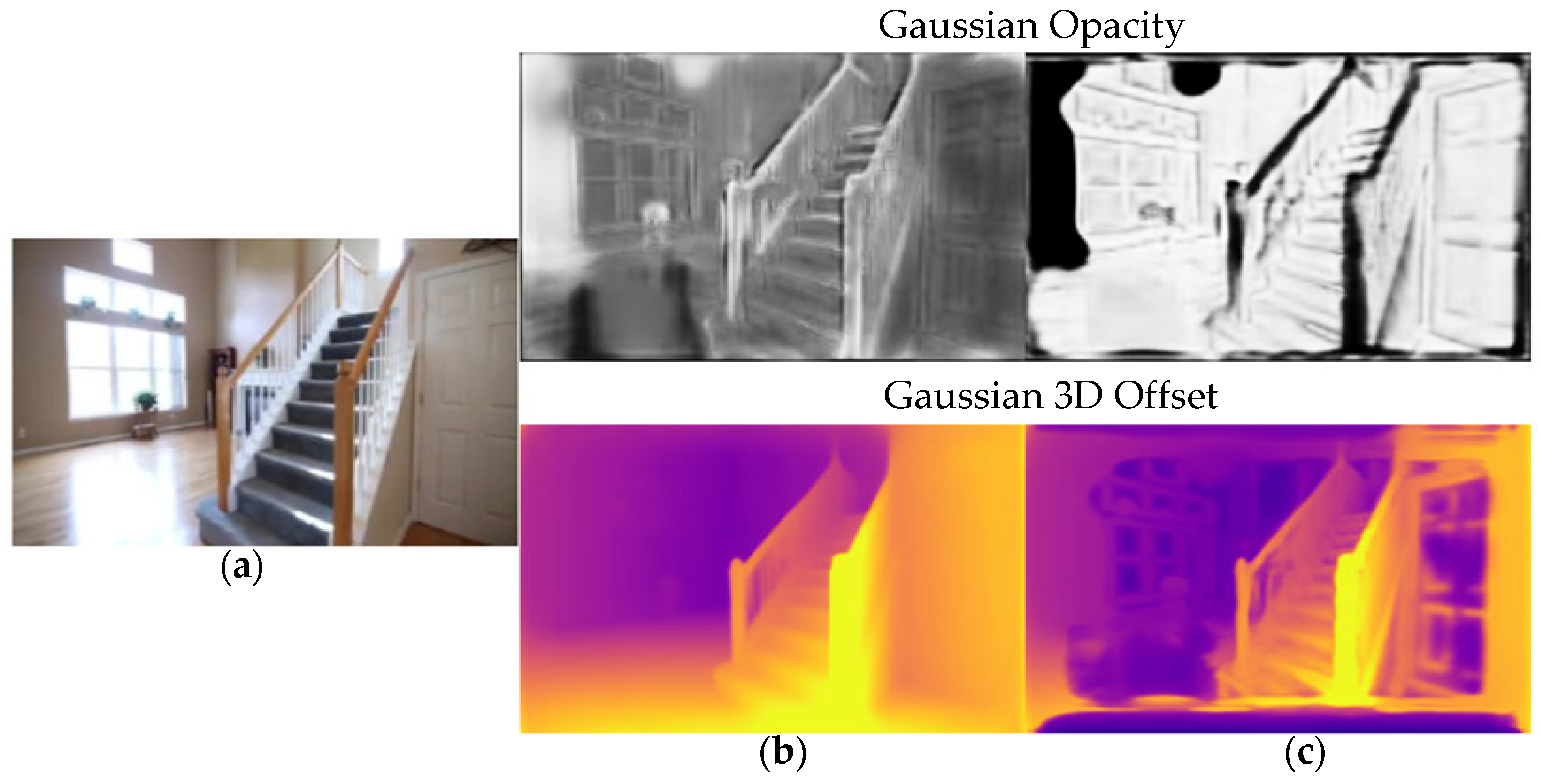 - Chen, Y.; Xu, H.; Zheng, C.; Zhuang, B.; Pollefeys, M.; Geiger, A.; Cham, T.-J.; Cai, J. MVSplat: Efficient 3D Gaussian Splatting from Sparse Multi-View Images. In Proceedings of the European Conference on Computer Vision (ECCV), Milan, Italy, 29 September–4 October 2024; Springer Nature: Cham, Switzerland, 2024; pp. 370–386. [Google Scholar]