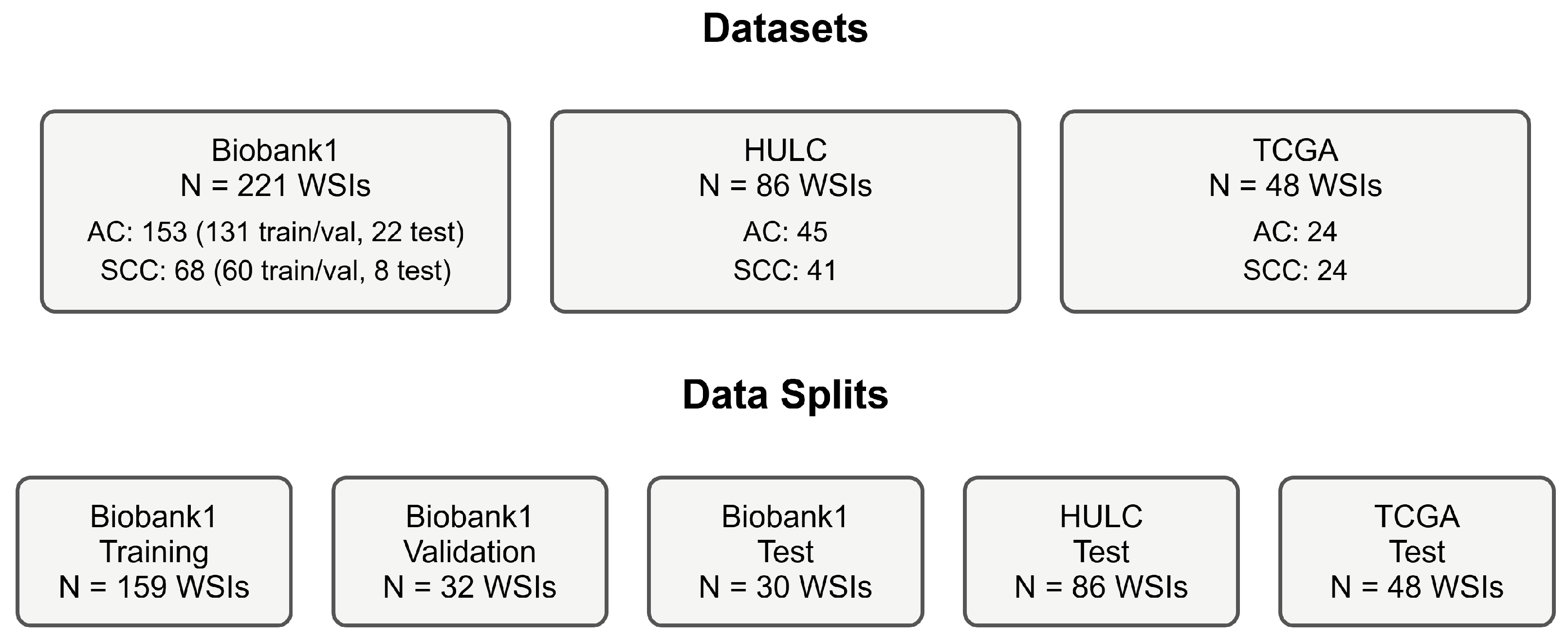 - Kludt, C.; Kludt, C.; Wang, Y.; Ahmad, W.; Bychkov, A.; Fukuoka, J.; Gaisa, N.; Kühnel, M.; Jonigk, D.; Pryalukhin, A.; et al. Next-generation lung cancer pathology: Development and validation of diagnostic and prognostic algorithms. Cell Rep. Med. 2024, 5, 101697. [Google Scholar] [CrossRef]