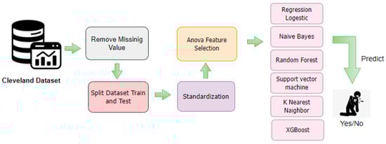 Detailed workflow of the proposed coronary artery disease (CAD) prediction model. The framework starts with data cleaning by removing missing values, followed by dataset splitting and standardization. ANOVA-based feature selection identifies the most significant attributes, which are then used to train multiple classifiers including Logistic Regression, Naïve Bayes, Random Forest, SVM, KNN, and XGBoost.