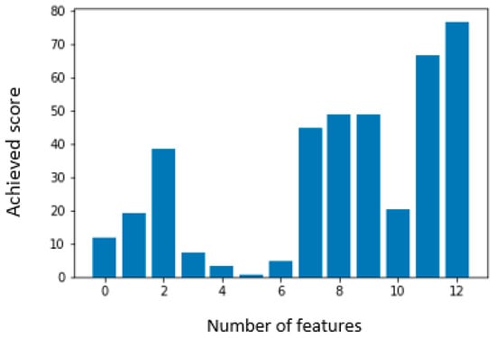 Using feature selection algorithms is a suitable solution for saving execution time and computing resources and improving prediction results [38]. ANOVA is used to compare the mean values of several groups. In other words, this method is used to check the existence of a significant difference between the average values of several classes [39]. For Equation (9), which shows how to calculate the variance between classes, and are, respectively, the average number of observations in the class and the average of all observations, and is the number of observations in the class [40].