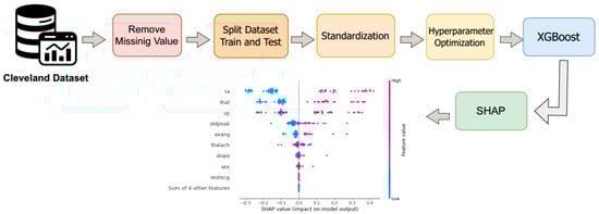 Workflow of the proposed second approach using the XGBoost model on the Cleveland Coronary Heart Disease dataset. The process includes handling missing values, data splitting and standardization, tuning XGBoost hyperparameters, model execution, and applying SHAP for result interpretation.