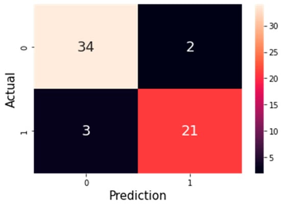 Confusion matrix of the Support Vector Machine (SVM) model with 9 selected features using the ANOVA method. In this matrix, 0 represents non-disease (healthy) cases and 1 represents patients with heart disease. The model correctly classified 34 healthy cases and 21 patients, while 3 healthy cases were misclassified as patients and 2 patients were misclassified as healthy.