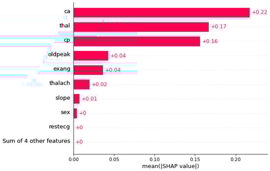The SHAP algorithm was applied to the output of the constructed model. Figure 8 illustrates the feature importance. The length of each bar represents the overall impact of the feature on the model’s prediction. In this plot, the most important features are listed in descending order. Features with higher bars contribute more to the model’s decision-making and can help identify key factors related to heart disease, thus possessing high predictive power. In this diagram, the features number of major vessels colored by fluoroscopy (Ca), heart condition (Thal) and chest pain (Cp) have the greatest effect on the output. Figure 8 shows the corresponding Beeswarm plot.