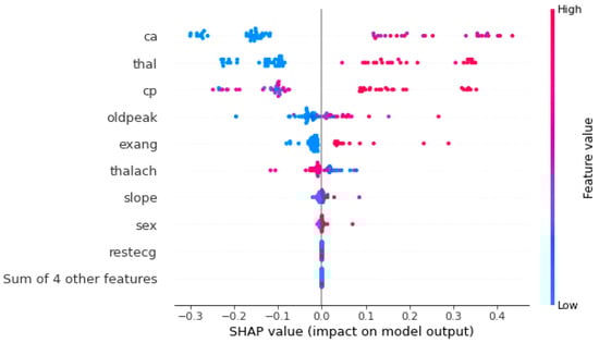 Each point in Figure 9 summarizes a Shapley value for one feature and one data instance, indicating both the magnitude and direction of the feature’s impact on the model’s prediction. The color of each point represents the actual value of the feature in that instance (higher values in red and lower values in blue). According to Figure 8, the feature Ca, which represents the number of major vessels, has the strongest effect on the model’s output. As shown, higher values of this feature increase the probability of heart disease. The heart condition (Thal) and chest pain (Cp) features follow in importance. Like Ca, higher values of these features increase the likelihood of heart disease, while lower values decrease it.