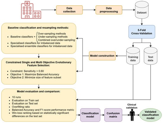 This section presents the dataset and clinical variables used in our study, followed by a description of the methods evaluated. We first introduce the baseline approaches commonly used to address class imbalance, including data-level, algorithm-level, and hybrid strategies. Next, we describe our proposed framework based on constrained EAs for FS, covering both single- and multi-objective optimization variants. Finally, we outline the evaluation protocol and statistical tests employed to compare all methods. The overall workflow of the proposed methodology is summarized in Figure 1.