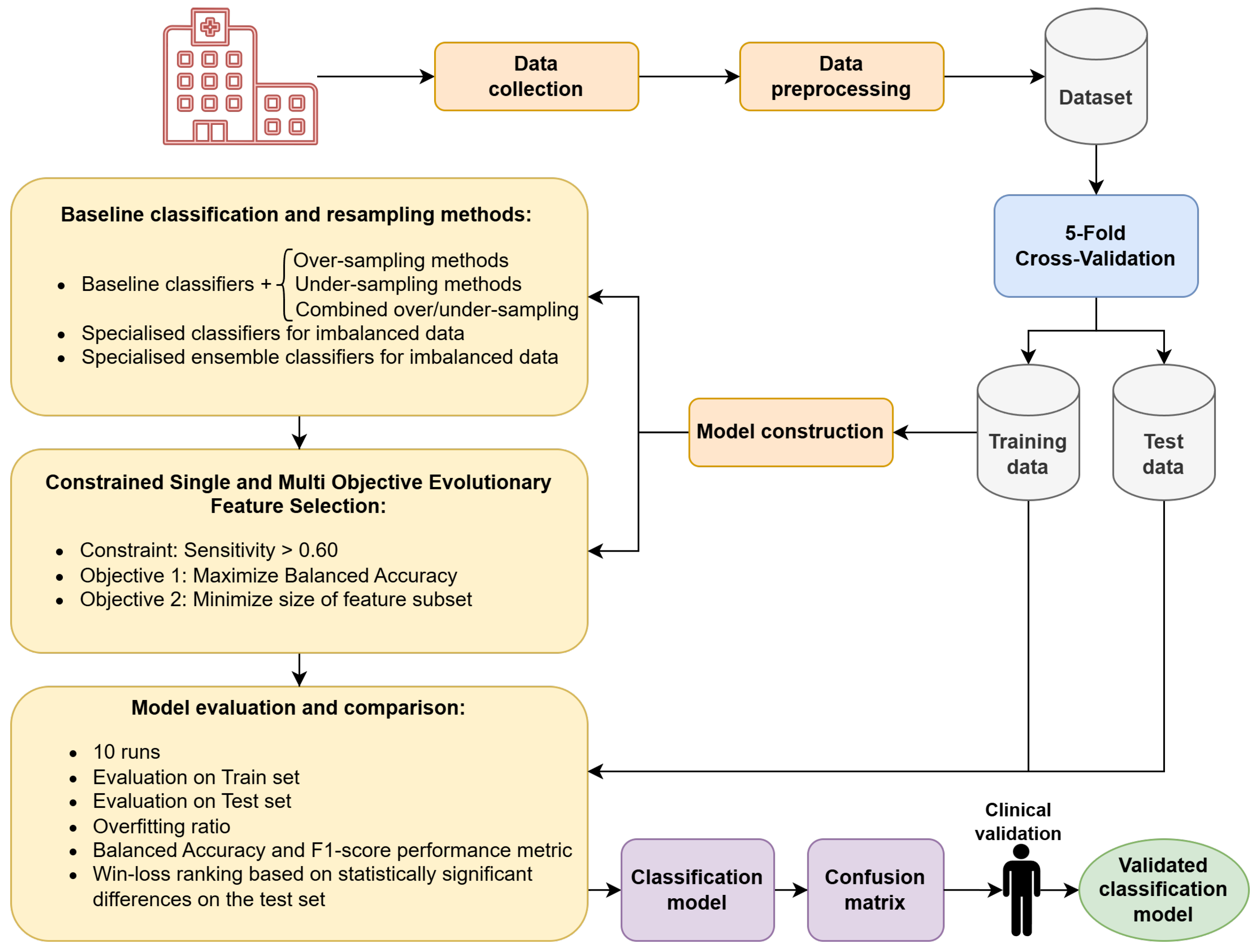 This section presents the dataset and clinical variables used in our study, followed by a description of the methods evaluated. We first introduce the baseline approaches commonly used to address class imbalance, including data-level, algorithm-level, and hybrid strategies. Next, we describe our proposed framework based on constrained EAs for FS, covering both single- and multi-objective optimization variants. Finally, we outline the evaluation protocol and statistical tests employed to compare all methods. The overall workflow of the proposed methodology is summarized in