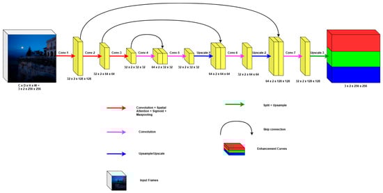 The proposed Zero-3DCE network, illustrated in Figure 2, follows an encoder–decoder architecture with depth-wise separable 3D convolutions and spatial attention. The input to the network is a low-light video clip . Zero-3DCE operates on short video clips rather than single frames. The temporal depth is set to D = 2, meaning that two consecutive frames are processed jointly using 3D convolutions.