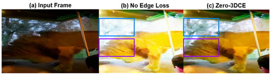 The model was retrained with the edge detection loss omitted. Without the loss, the enhanced inferred frame of Figure 3b appears over-exposed and without key image features. This is particularly evident in the blue and purple squares, where in Figure 3b, due to over-exposure, there is a loss of detail. The challenges observed in Figure 3b are not present in the frames enhanced using the complete model, as seen in Figure 3c. The results illustrate how the edge loss assists the network in maintaining local contrasts and preventing over-exposure.
