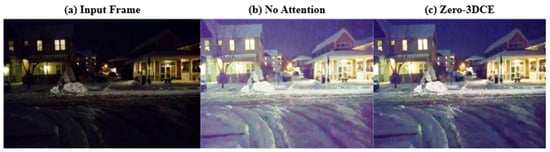 Without spatial attention, the inferred frame, as demonstrated in Figure 5b, is noisy and over-enhanced. This demonstrates the attention mechanisms’ role in enabling the model to focus on key parts of the image, specifically under-exposed regions, resulting in balanced enhancement, as seen in Figure 5c.