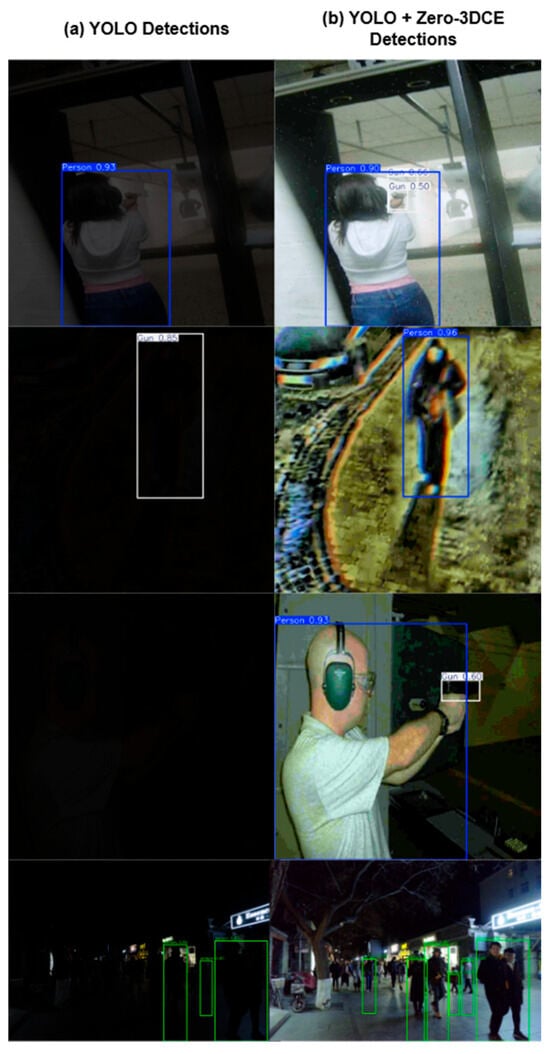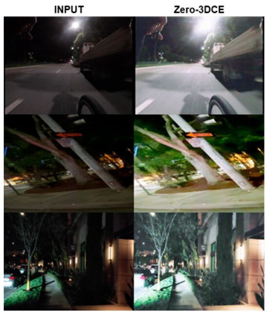 The model was coupled with a fine-tuned YOLOv11 model and tested on its ability to enhance and detect objects using [42,43,44] along with the DarkFace dataset [45]. Qualitative results are shown in Figure 10, and quantitative detection metrics are summarized in Table 3. The results show that Zero-3DCE can improve the detection rates of the YOLO model, supporting the stated hypothesis that the light enhancement network in question, Zero-3DCE, can improve CV tasks.