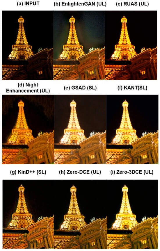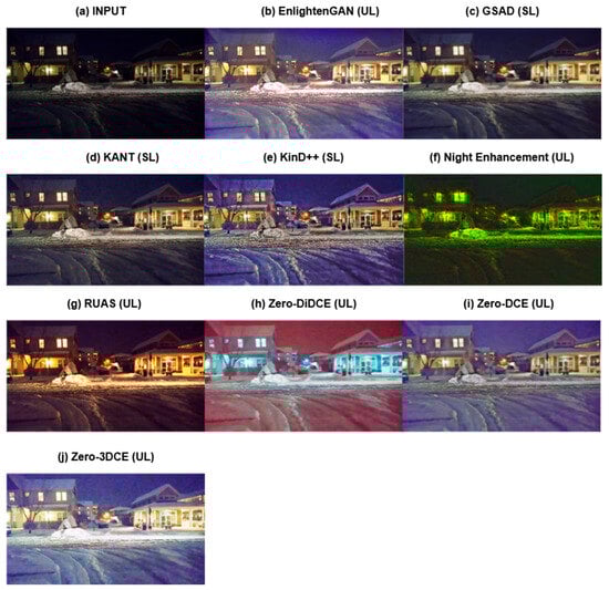 Visual comparisons with other low-light enhancement models [8,14,16,37,38,39,40,41] are presented in Figure 8 and Figure 9. Figure 8 presents the single-frame comparisons, while Figure 9 presents multi-frame comparisons. In Figure 9, EnlightenGAN, RUAS, Night Enhancement, and KinD++ enhance the single frame, but in doing so, the resultant image appears discolored. GSAD over-enhances the image, causing the dark background to appear lighter than it should. Zero-DCE only slightly enhances the image, leaving behind areas of low contrast. Kant and Zero-3DCE achieve similar results, but as presented in Table 2, Zero-3DCE achieves these results faster.