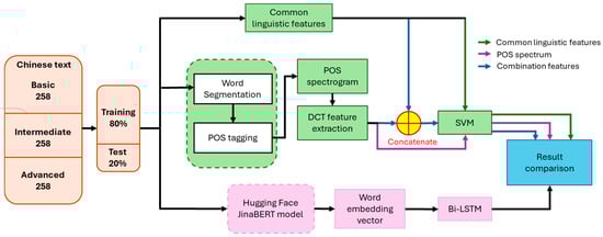 In addition, the design of input features significantly affects model performance. Yao-Ting Sung’s study employed 24 linguistic features across four categories: lexical, semantic, syntactic, and cohesion-related features. These features are traditional linguistic variables and are slightly different from what we proposed. Our study not only includes linguistic features such as the type–token ratio, average sentence length, total vocabulary size, and word level, but incorporates POS spectrum information. By visualizing the distribution of POS tags, this approach supported temporal information of the Chinese text. This innovative feature design may effectively enhance the model’s ability to assess text readability, thereby improving classification performance. Consequently, the expansion of dataset size and the integrated linguistic features with the POS spectrum contributed to a practical and satisfactory result in Chinese text readability grading.