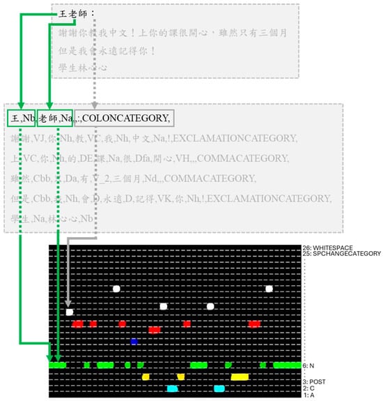 Firstly, we used the CkipTagger [27] developed by the Academia Sinica, together with the designed mapping table to perform lexical segmentation and POS annotation on the original Chinese texts. Then, the tagging results are converted into a 2D matrix image, where the x-axis represents the sequential position of characters or words in the text, and the y-axis corresponds to 26 POS labels, including 14 primary POS categories consisting of nouns, verbs, adjectives, adverbs, pronouns, determiners, prepositions, conjunctions, particles, numerals, classifiers, modal verbs, onomatopoeia, interjections, and 11 punctuation marks and a whitespace.