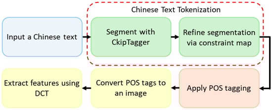 Compared to the LSTM network, the SVM neural network lacks mechanisms to capture temporal dependencies inherent in language data. However, the temporal information plays a dominant role in NLP studies. Therefore, this study employs imaged POS features combined with common linguistic features for the SVM model that allows the proposed SVM architecture to reflect the temporal features. The proposed process is shown in Figure 4. Word segmentation and the first stage of POS tagging are performed using the CKIP toolkit. Because of the intrinsic differences in tokenization between alphabet language and hieroglyph, the constraint mapping table is necessary for meaningful output for the final POS tagging. Then the words in each sentence are arranged in temporal order to construct a two-dimensional image representing the POS structure. This concept is based on the idea that textual hierarchy is related to the arrangement and complexity of POS patterns. Consequently, the periodic structural information could be extracted from the DCT coefficients of the POS.