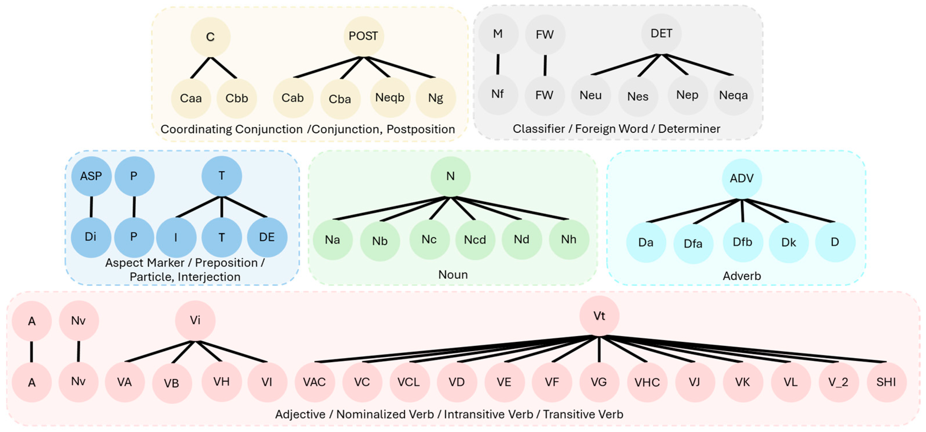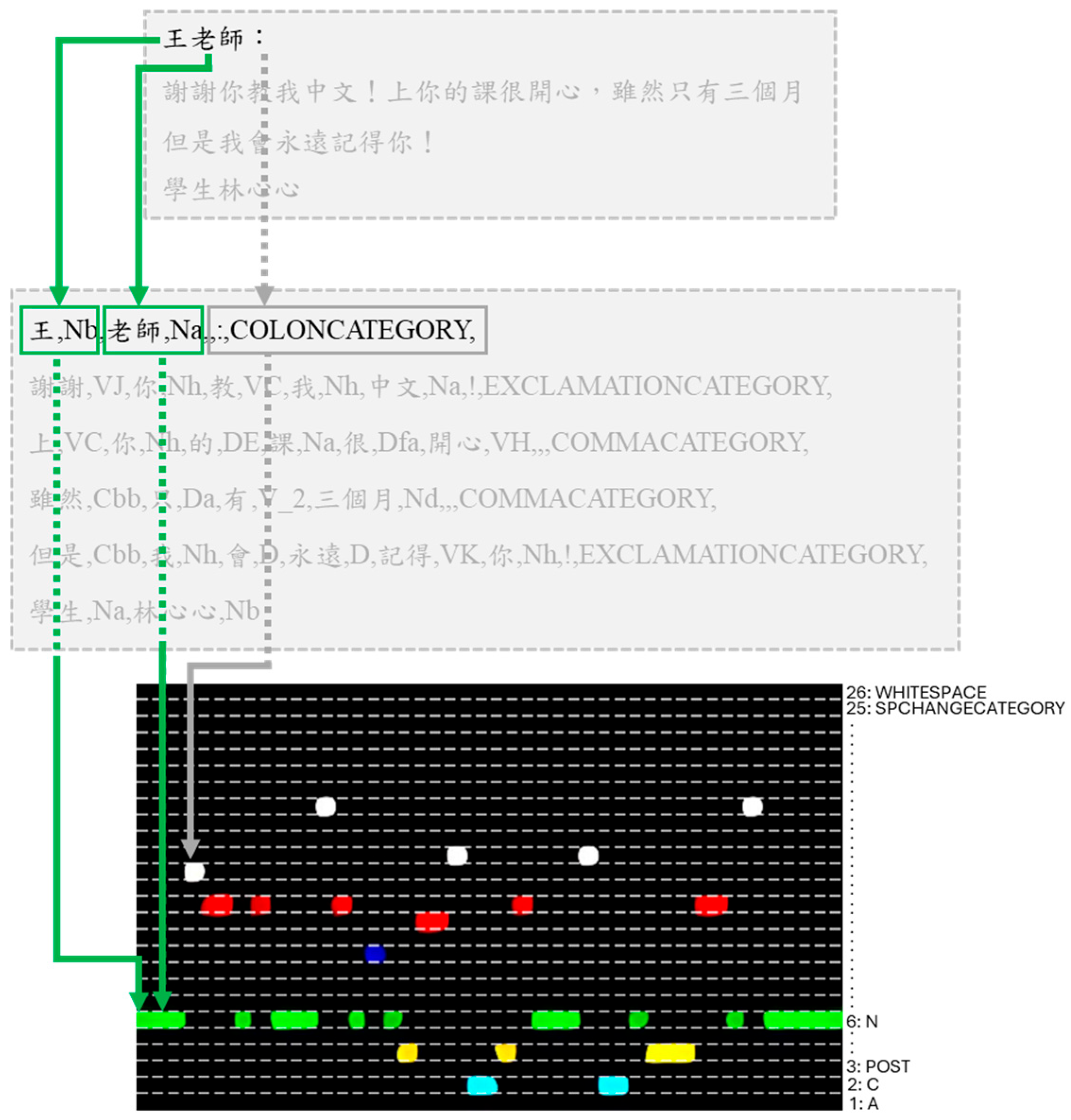 27] developed by the Academia Sinica, together with the designed mapping table to perform lexical segmentation and POS annotation on the original Chinese texts. Then, the tagging results are converted into a 2D matrix image, where the x-axis represents the sequential position of characters or words in the text, and the y-axis corresponds to 26 POS labels, including 14 primary POS categories consisting of nouns, verbs, adjectives, adverbs, pronouns, determiners, prepositions, conjunctions, particles, numerals, classifiers, modal verbs, onomatopoeia, interjections, and 11 punctuation marks and a whitespace.