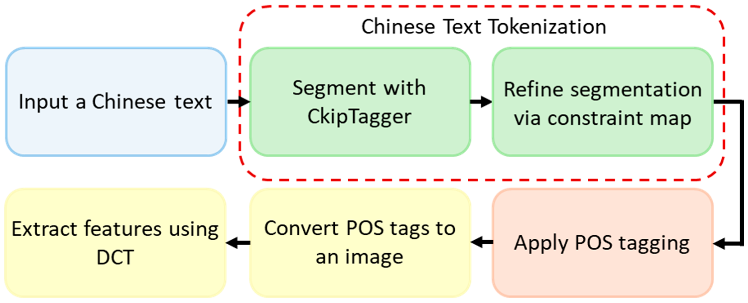 Figure 4. Word segmentation and the first stage of POS tagging are performed using the CKIP toolkit. Because of the intrinsic differences in tokenization between alphabet language and hieroglyph, the constraint mapping table is necessary for meaningful output for the final POS tagging. Then the words in each sentence are arranged in temporal order to construct a two-dimensional image representing the POS structure. This concept is based on the idea that textual hierarchy is related to the arrangement and complexity of POS patterns. Consequently, the periodic structural information could be extracted from the DCT coefficients of the POS.