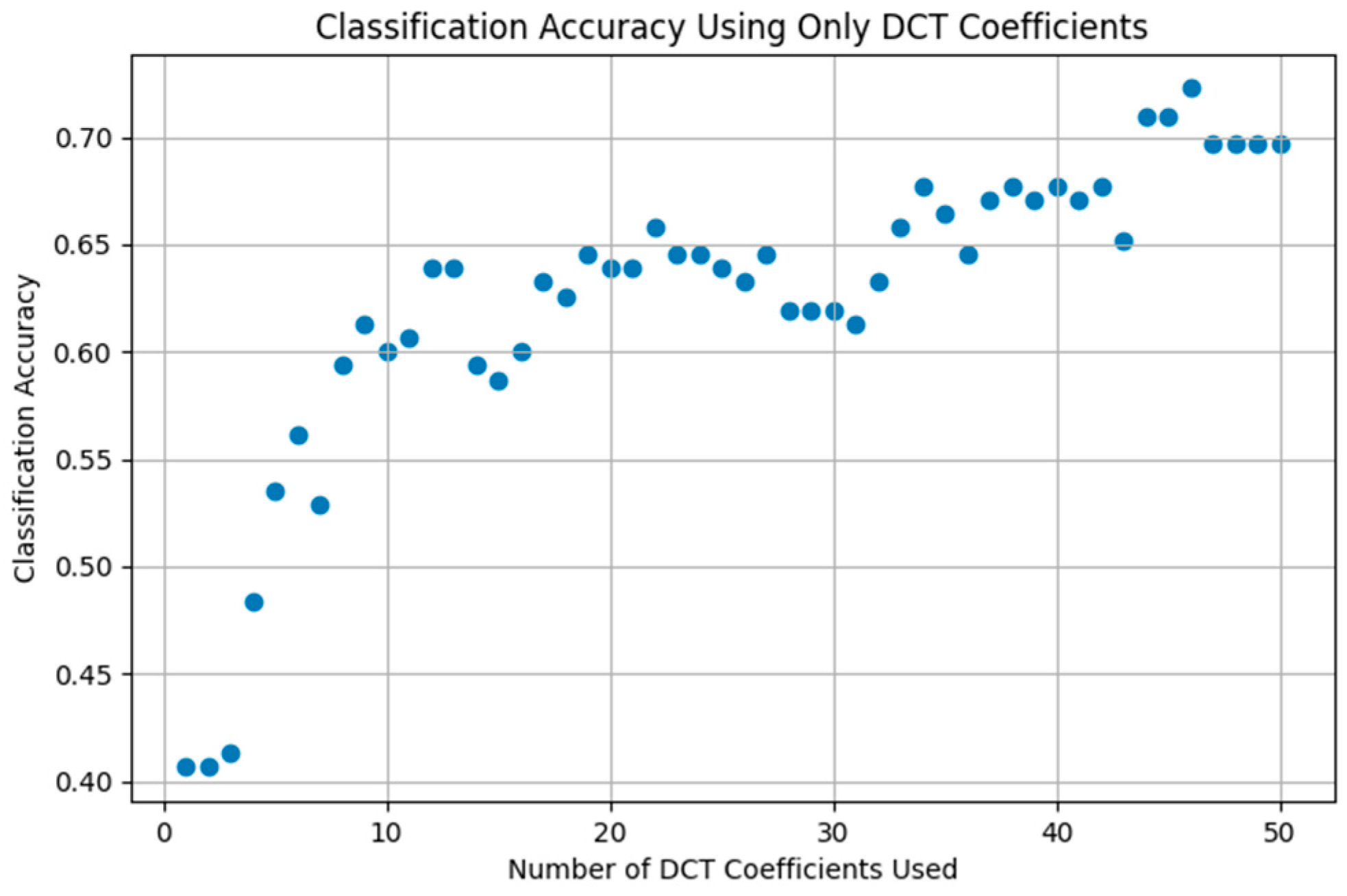 Figure 5, it can be observed that when only the DCT-transformed coefficients are used as input features for the SVM model, the classification accuracy gradually increases as the number of selected coefficients grows. However, once the number of coefficients exceeds a certain threshold, the accuracy begins to plateau. This indicates that low-order frequency components play a critical role in classification performance, while introducing additional high-frequency coefficients may cause the classification to be saturated. Basically, the integration of hetero features is a complicated issue; inter/intra feature dependency and redundancy analysis are commonly required tools. However, the analysis needs more data scale to avoid an overfitted scenario. According to the tendency of curve and the classification accuracy shown in