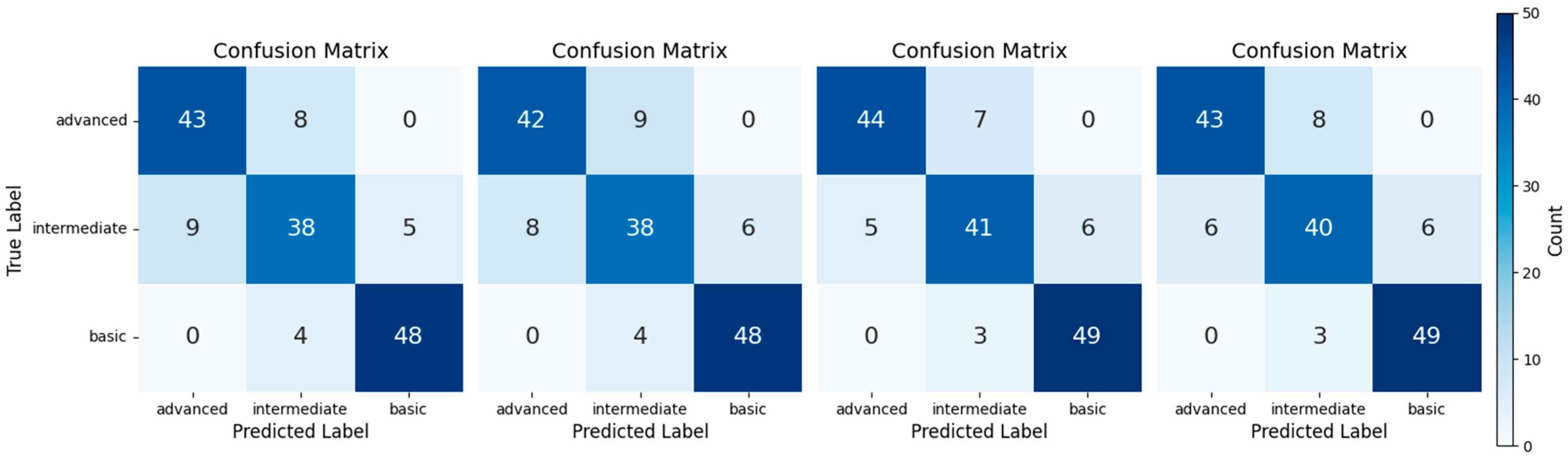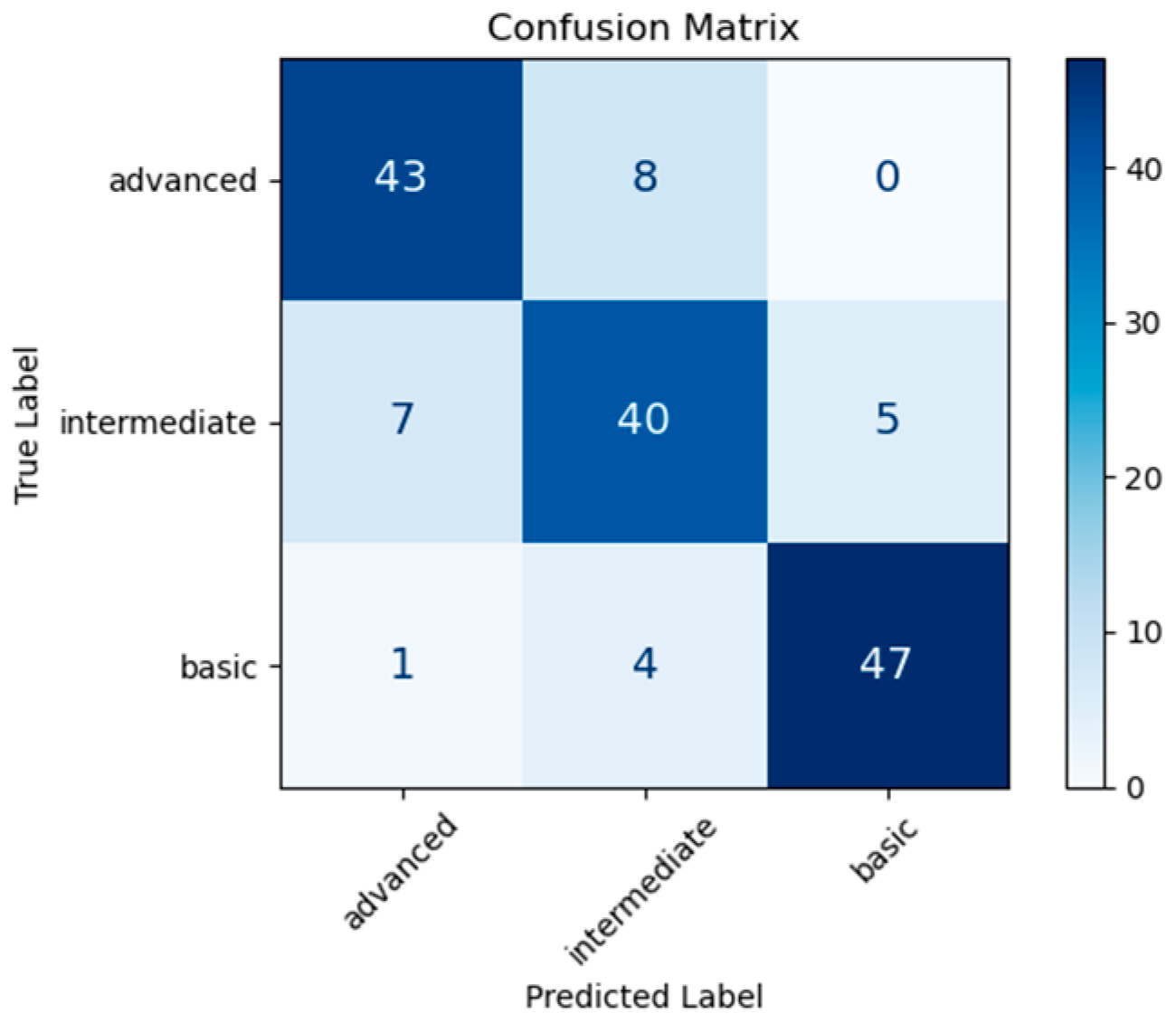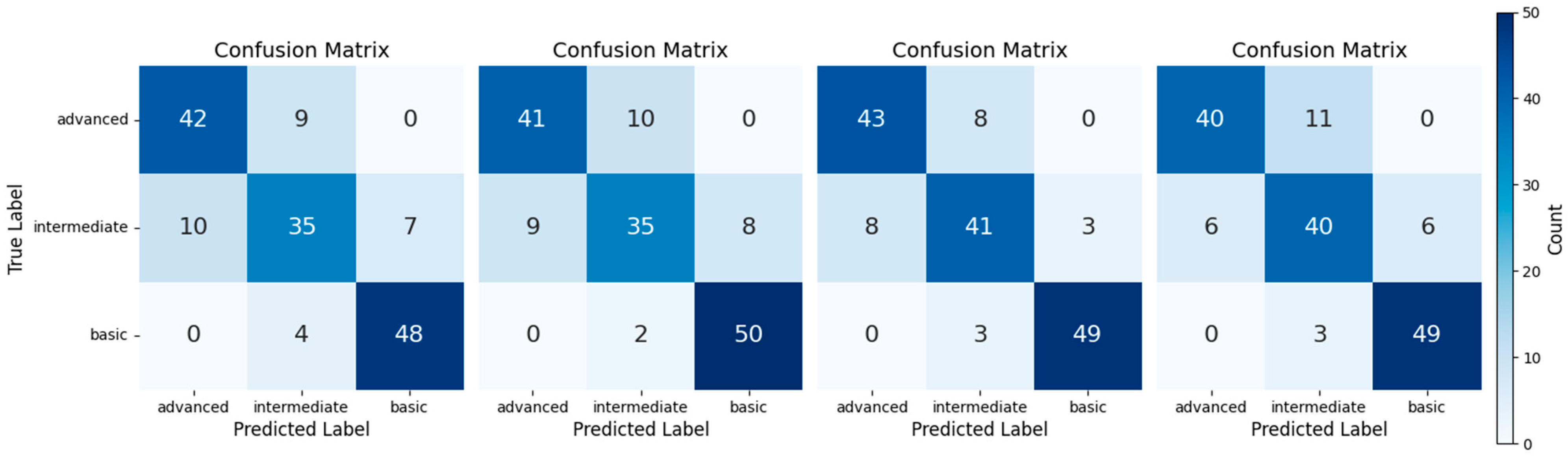 To evaluate the performance of the two methods, the confusion matrix is utilized. Basically, the confusion matrix is the most popular evaluation metric. The numbers in the confusion matrix represent the counts of correct and incorrect predictions made by a classification model, categorized by the actual and predicted text readability, for example, true positives (TPs), where the elements away from the diagonal line are the classifier errors, which indicate classification errors such as false positives (FPs), where the model overestimates the difficulty; false negatives (FNs), where it underestimates it; and true negatives (TNs), where the model correctly identifies non-target class samples. With the analyis and computation of various metrics, including accuracy, precision, recall, and the F1-score, these metrics offer a detailed perspective on our classifier’s performance, aiding us in identifying its strengths and weaknesses in handling different levels of text difficulty.