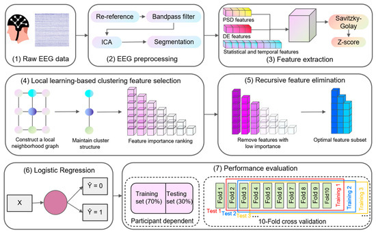 Figure 1 illustrates the overall framework of this study, which comprises seven sequential stages. The initial stage involves EEG data acquisition from participants. The subsequent stage encompasses preprocessing of the raw EEG signals. The third stage focuses on extracting relevant features from the preprocessed data. The fourth stage applies the LLCFS algorithm to rank features according to their classification contribution. The fifth stage employs the RFE approach to refine the feature set to the optimal dimensionality. The sixth stage feeds the selected features into the LR classifier for model training. The final stage conducts performance evaluation using both subject-dependent and ten-fold cross-validation methodologies to assess classification accuracy.