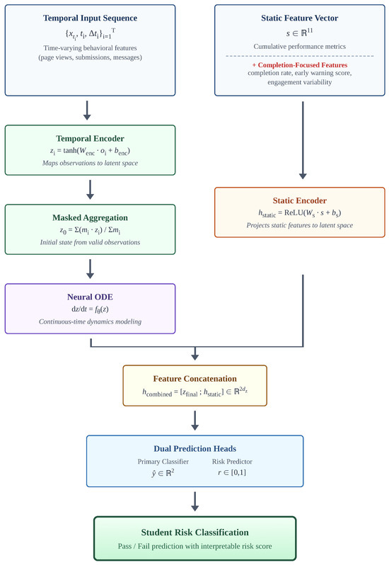 Completion-aware Risk Neural ODE (CR-NODE) integrates continuous-time temporal modeling via Neural Ordinary Differential Equations with completion-focused static features for student dropout prediction. The architecture comprises four interconnected components: a temporal observation encoder, an ODE-based latent dynamics module, a static feature encoder, and dual prediction heads for classification and risk estimation. Figure 1 provides a schematic overview of the complete architecture and Table 3 defines all mathematical notation used throughout the model description.