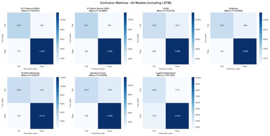 We compare CR-NODE against six baseline approaches (Logistic Regression, Random Forest, XGBoost, Gradient Boosting, LSTM, and Basic Neural ODE) representing diverse modeling paradigms to establish comprehensive performance benchmarks. The comparison includes both traditional machine learning methods operating on static aggregated features and modern temporal deep learning architectures.