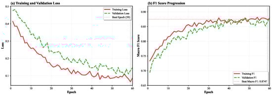 with momentum parameters and , learning rate , and weight decay . Gradient clipping with maximum L2 norm of 1.0 prevents exploding gradients that could destabilize training. The learning rate is reduced by a factor of 0.5 when the validation Macro F1 score fails to improve for 8 consecutive epochs, enabling fine-tuning in later training stages. Training proceeds for a maximum of 60 epochs with early stopping triggered if no improvement occurs within 20 epochs, preventing overfitting while ensuring convergence. Mini-batches of 64 sequences are processed with shuffling enabled during training.