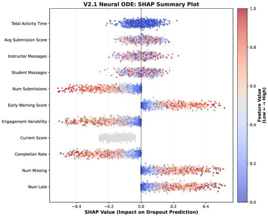 The challenge of model interpretability in student risk prediction has gained increasing attention [17,18]. Adadi and Berrada [19] surveyed explainable artificial intelligence (XAI) techniques, emphasizing the importance of transparency in educational applications. SHapley Additive exPlanations (SHAP), introduced by Lundberg and Lee [20], provides a unified approach to interpreting model predictions. Recent work has demonstrated the effectiveness of SHAP for understanding student dropout models [21], though prior studies have focused primarily on static feature importance rather than temporal behavioral patterns.