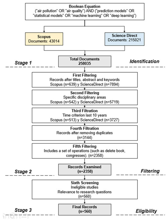 A systematic search was conducted in Scopus and ScienceDirect, following the recommended completeness guidelines for high-quality reviews [40,41]. The search strategy was designed to capture scientific literature on air pollution and predictive modelling, considering both statistical and artificial intelligence approaches. The Boolean equation (“air: pollution” OR “air quality”) AND (“prediction models” OR “statistical models” OR “machine learning” OR “deep learning”), optimized to encompass multiple dimensions of the problem, was used. This procedure identified a large corpus of publications: 43,014 in Scopus and 215,021 in ScienceDirect. Thus, a broad and rigorous coverage of the state of the art was ensured, in accordance with the principles of methodological integrity in systematic reviews [42].