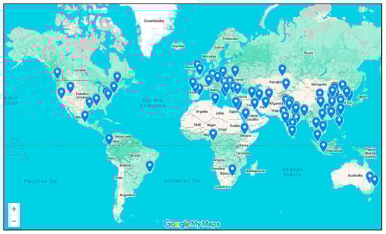 From a review of 412 papers, 194 city-specific studies were identified. These were selected based on a manual screening of article titles, including only those that explicitly mentioned both a city and a country, indicating a clearly localized application of predictive modeling. The geographic classification was based on the city analyzed in each study, not the authors’ institutional affiliation. Although some cities, such as Beijing or New Delhi, appear multiple times, each record represents a unique study with different methodologies, datasets, or modeling frameworks.