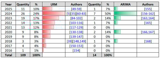 From the sample of 412 articles analyzed by a systematic review, 123 studies were identified that implement traditional statistical models in the prediction of air quality. Of these, 109 employed multiple linear regression (MLR), representing 88.6% of the total number of statistical models detected. In contrast, only 14 articles used ARIMA models (11.4%), mainly applied to time series with seasonal components. This distribution shows a strong preference for linear parametric approaches in the reviewed papers, despite the increasing demands of modeling in complex and nonlinear environments (see Figure 4).