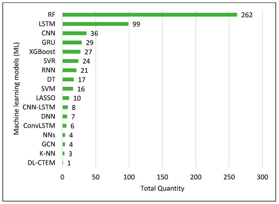 On the other hand, multiple machine learning (ML) models applied individually or in combination were identified, resulting in 574 records of ML model use. This figure reflects that several studies implemented more than one technique for comparative or complementary purposes. The most used models were Random Forest (RF) with 262 appearances (45.6%), followed by Support Long Short-Term Memory (LSTM) with 99 mentions (17.2%) and Convolutional Neural Network (CNN) with 36 records (6.3%). Other models such as GRU, XGBoost, SVR, and RNN also showed a significant presence, although with lower relative frequency (see Figure 5).