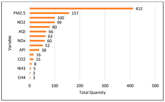 The systematic review identified 1177 individual records of variables used in predictive air quality models, indicating that many studies integrate multiple types of variables in the same architecture. The most used variable was CO with 412 mentions (35.0%), followed by PM2.5 (13.3%), PM10 (8.5%), NO2 (8.4%) and O3 (6.8%). Indicators such as AQI (5.61), SO2 (5.35), NOx (5.10), ozone (4.42) and complementary variables such as API, deaths and CO2 also stood out.