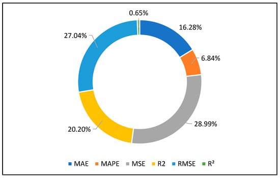 Of the total sample, 307 records of predictive performance evaluation indicators were identified, evidencing a combined use of metrics in various studies. The most used indicator was the mean square error (MSE) with 89 mentions (28.99%), followed by the root mean square error (RMSE) with 83 (27.04%) and the coefficient of determination (R2/R2) with 64 combined records (20.85%). Other metrics such as mean absolute error (MAE) (16.28%) and mean absolute percentage error (MAPE) (6.84%) also showed relevant presence. This distribution reveals a generalized preference for metrics focused on the precision of the fit, particularly those that penalize large deviations, such as RMSE and MSE (see Figure 8).