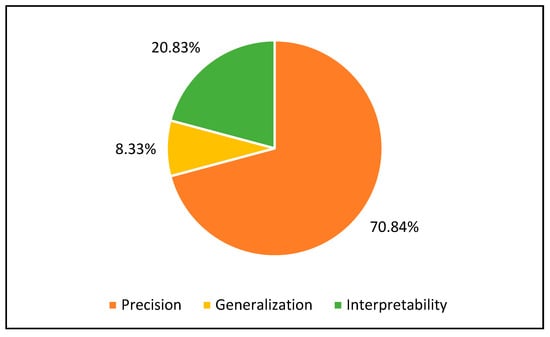 Analysis of the 24 studies comparing statistical and machine learning models reveals that accuracy has been the most explored axis, with 17 investigations (70.8%) focused on improving predictive fit [50,52,54,55,56,61,68,79,82,84,99,121,132,142,144]. In contrast, only 5 studies (20.8%) addressed interpretability as a main criterion [65,106,147,150,152], and 2 studies (8.3%) explicitly focused on the generalizability of the model [97,123,193].