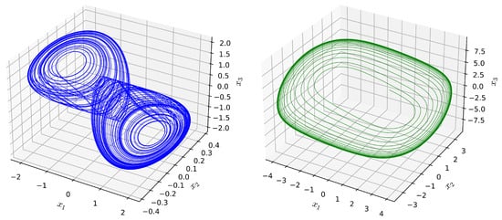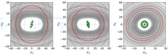 However, if we replace the symbolic variable with a specific positive number, the prenex Formula (63) becomes a decision problem with the possible results true or false, which could be solved on a standard PC in a few hundred milliseconds. In combination with a bisection method, the bound can therefore be calculated with arbitrary precision. Carrying out QE on (63) with yields true, whereas yields false. The levels sets of this bound are ellipses shown in Figure 5 in red. In addition, the transients already depicted in Figure 4 are also shown, using blue and green colors for the chaotic attractor and the stable limit cycle, respectively. When specifying the elements of the matrix P, arbitrary decisions were also made to determine and . Therefore, other parameter values for the admissible ranges were generated using a random number generator, and we attempted to find a bound using the prenex Formula (63). The levels resulting from these bounds are shown in gray in Figure 5.