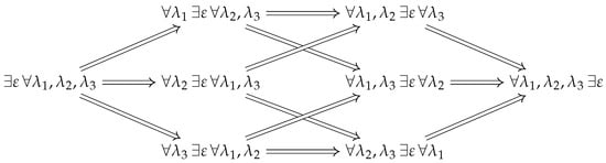 Swapping the order of quantifiers and the implications of the resulting statements. Shown are all combinations for three universal quantifiers.