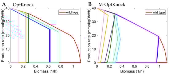 Rate envelopes of design strategies (in colours other than red) identified by different methods with up to five knockouts for ethanol production. Each colored line represents a design strategy (excluding the red line). Each method calculated 8 best design strategies with 10 evenly spaced values from 0.1 to 0.5, then removed those with a maximum production rate of zero. (A) Design strategies (sets of abbreviated reaction names) of OptKnock represented by coloured lines from left to right: {O2tex, FORtex, XYLI2, TKT1, PGI}, {O2tex, FORtex, FE2tex, TKT2, PGI}, {O2tex, FORtex, FE3tex, TKT2, PGI}, {O2tex, FORtex, TKT2, FBA, TALA}, {FORtex, EDA/EDD, XYLI2, FBA, PGI}, {FORtex, EDA/EDD, XYLI2, PPM, PGI}, {FORtex, FE2tex, EDA/EDD, XYLI2, PGI}, {FORtex, F6PA, EDA/EDD, TALA, FBA}. (B) Design strategies of M-OptKnock represented by coloured lines from left to right: {O2tex, FORtex, FE2tex, FUM, D_LACt2pp}, {O2tex, FORtex, RPE, FUM, D_LACt2pp}, {O2tex, FORtex, FUM, D_LACt2pp, TKT2}, {O2tex, FORtex, D_LACt2pp, PSERT/PSP_L, TKT2}, {O2tex, PGI DHAtpp, PSERT/PSP_L, GLCtex_copy2}, {O2tex, PPM, XYLI2, TKT2, DOXRBCNtpp}, {FORtex, XYLI2, D_LACt2pp, TKT2}, {FORtex, PPC, D_LACt2pp, PSERT/PSP_L, TKT2}. All abbreviated reaction names are derived from the GEM iML1515 model [35] and listed in Supplementary Note Table S2.