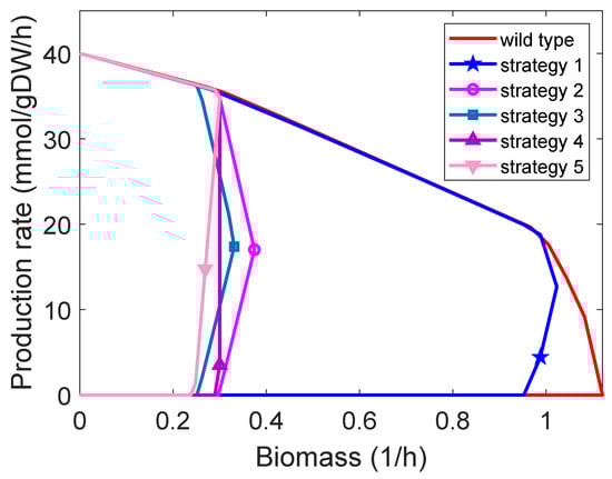 Rate envelopes of five design strategies (Table 2) identified by M-OptKnock with three knockouts for ethanol production.