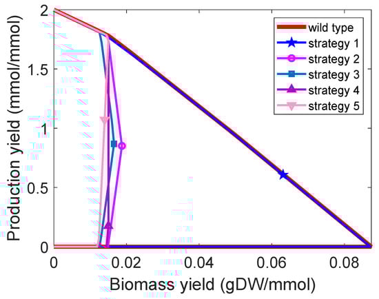 Yield envelopes of five design strategies (Table 2) identified by M-OptKnock with three knockouts for ethanol production.