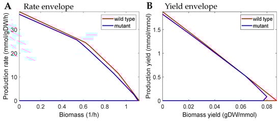 Rate and yield envelopes of a strain design by M-OptYiled with a knockout set of {FUM, LGTHL, GLBRAN2, SERD_D} for fumarate production. (A) Yield envelope. (B) Rate envelope. The resulting mutant is (weak) GYC but not GRC.