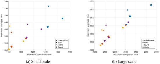 We further conduct numerical experiments on both small-scale and large-scale instances using the total objective function. The comparisons include four indicators: the lower bound, EDD, HAFG, and GAAM. For the genetic algorithm, the population size is set to 80, the crossover rate to 0.8, the mutation rate to 0.6, and the maximum number of iterations to 100.