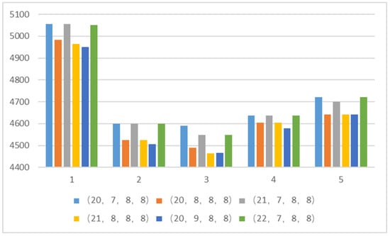 A sensitivity analysis is conducted on the processing time of large-scale instances under different machine scales. To provide more intuitive numerical insights, the results are presented in the form of a bar chart, as shown in Figure 4. The horizontal axis represents the five large-scale instances used in the previous experiments, while the vertical axis shows the objective function values obtained by the algorithm under six different machine scales. Each instance displays six bars corresponding to six different machine scales. The four numbers characterizing the scale represent the number of primary processing machines, the number of secondary processing machines, the number of primary processing types, and the number of secondary processing types.