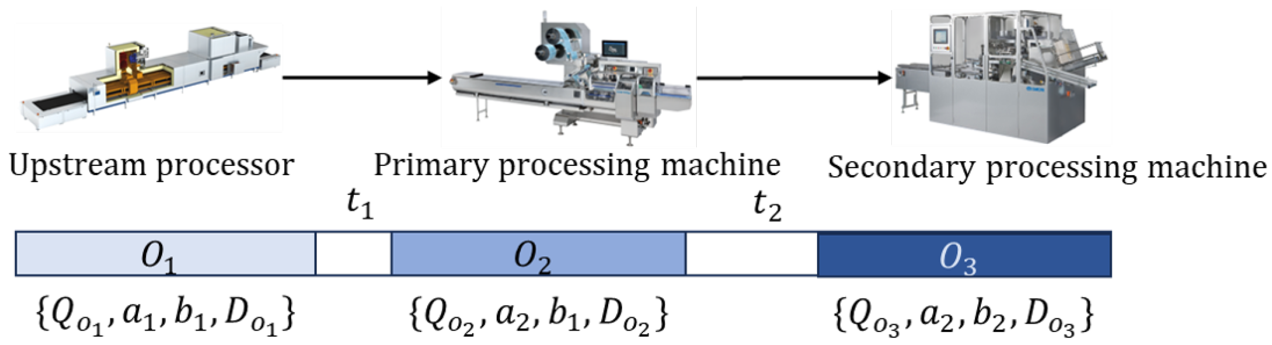 During production, both primary and secondary processing machines can switch between different processing specifications, which is referred to as a machine setup operation. Let the set of primary processing specifications be A and the set of secondary processing specifications be B. The setup times for primary and secondary processing machines are denoted by and , respectively; machines cannot perform processing during a setup operation. Furthermore, machines processing orders with different specifications have different rated processing speeds, depending on the order’s primary and secondary processing specifications. Figure 1 illustrates a simple example of production line stoppages caused by machine setup operations. This example considers a production system with only one primary processing machine and one secondary processing machine, in which only one processing specification can be handled at a time. In such a system, any setup operation on either machine will cause the entire production line to halt. The system processes three orders, , , and , sequentially. When switching the processing specification from to , the primary processing machine must undergo a setup operation, resulting in a production interruption of duration . Similarly, when switching the processing specification from to , the secondary processing machine requires a setup operation, causing a production interruption of duration .